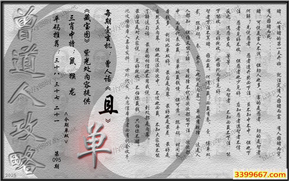 | 主题 :095期藏寶圖 新:碧落千门锁元气 老:胸中磊落藏伍兵 禁:兔 禁:4尾 |